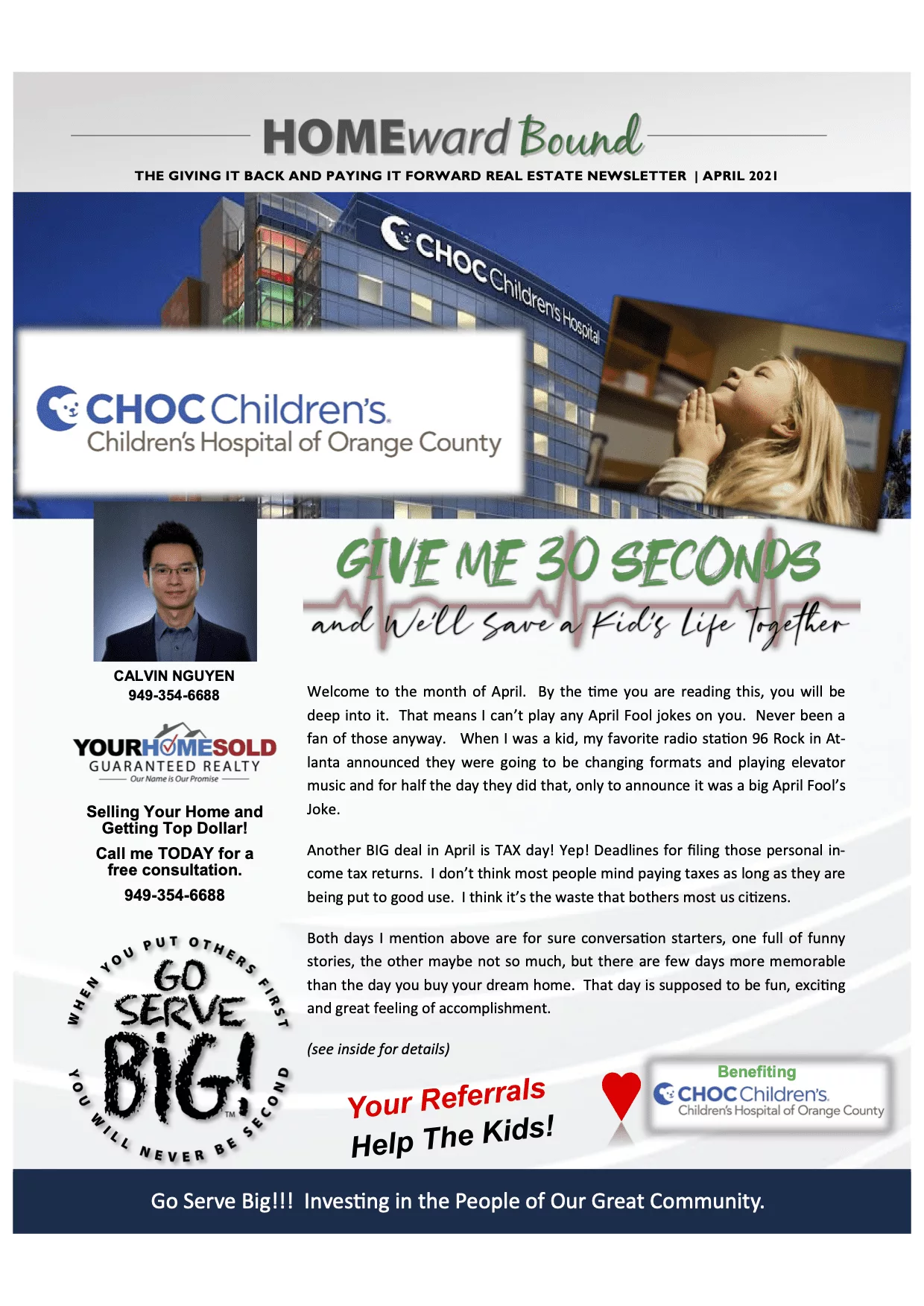 This year, we are on a mission to raise $50,000 for Children’s Hospital of Orange County . We do this by donating to them a portion of our income from homes we sell.