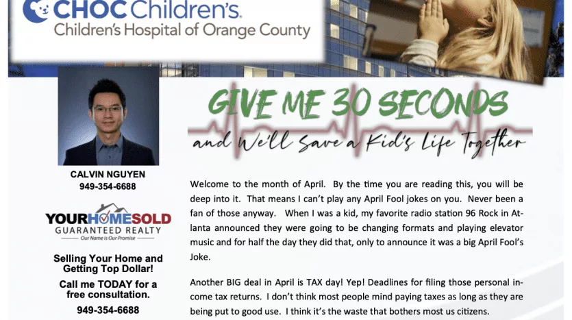 Just down the street from where I’m typing, Children’s Hospital of Orange County has a full house of kids with many fighting for their lives. And that is no April Fools joking matter. It’s also likely taxes are the furthest thing from the minds of the parents with kids at CHOC.