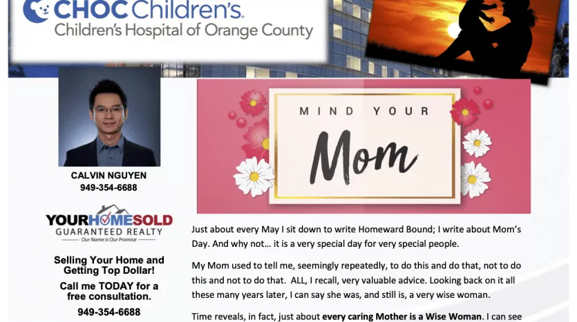 Right now, there are kids at CHOC who are trying to beat the Cancer Monster and other nasty debilitating diseases. Children’s is one of the best non-profit hospitals at treating kids, even leading the way in early diagnosis of autism and recovery of spinal cord injury. The Mom’s with kids being treated at Children’s are most likely NOT thinking about their special day this month. They are simply just being “Mom” doing what a real loving Mom does. God bless them for it