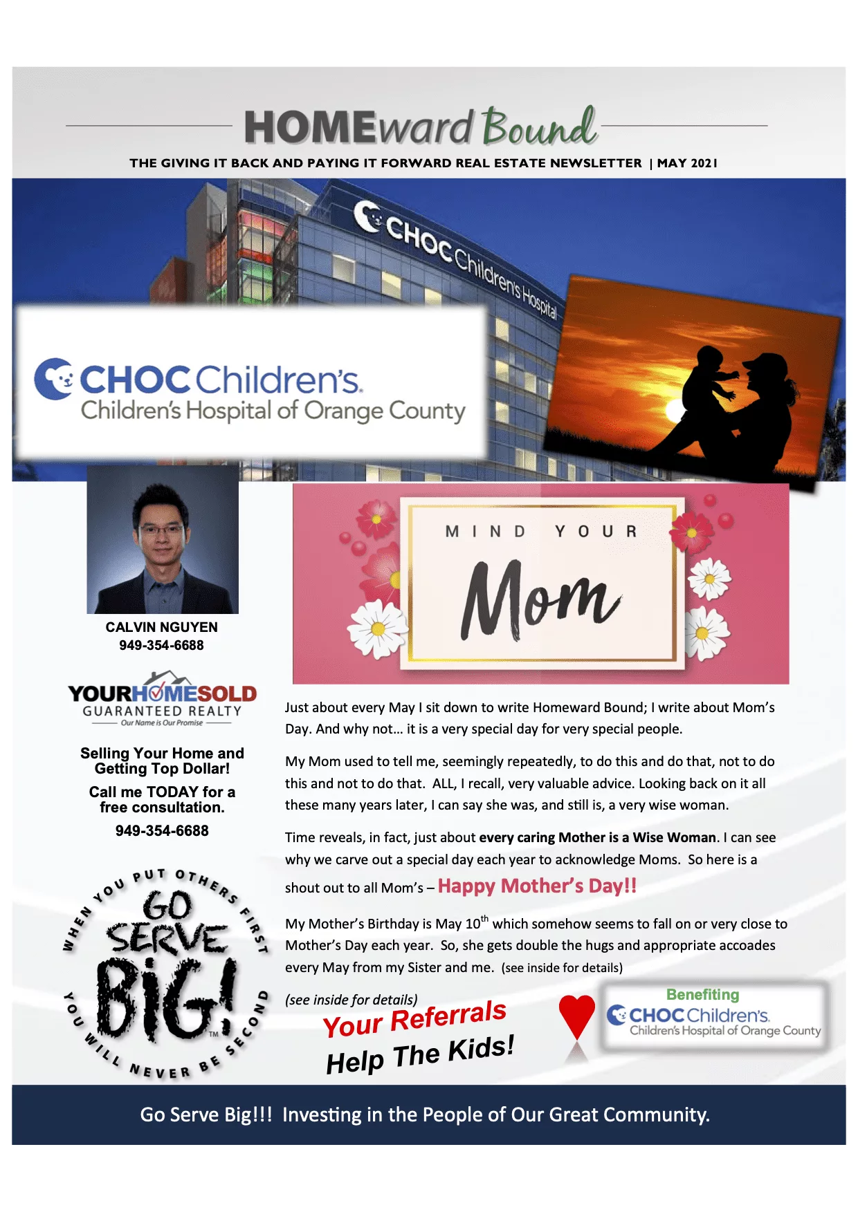 You may recall my team and I are on a mission to raise $50,000 for Children’s Hospital of Orange County (CHOC) in 2021. We do that by donating a portion of our income from home sales to this very worthy cause.