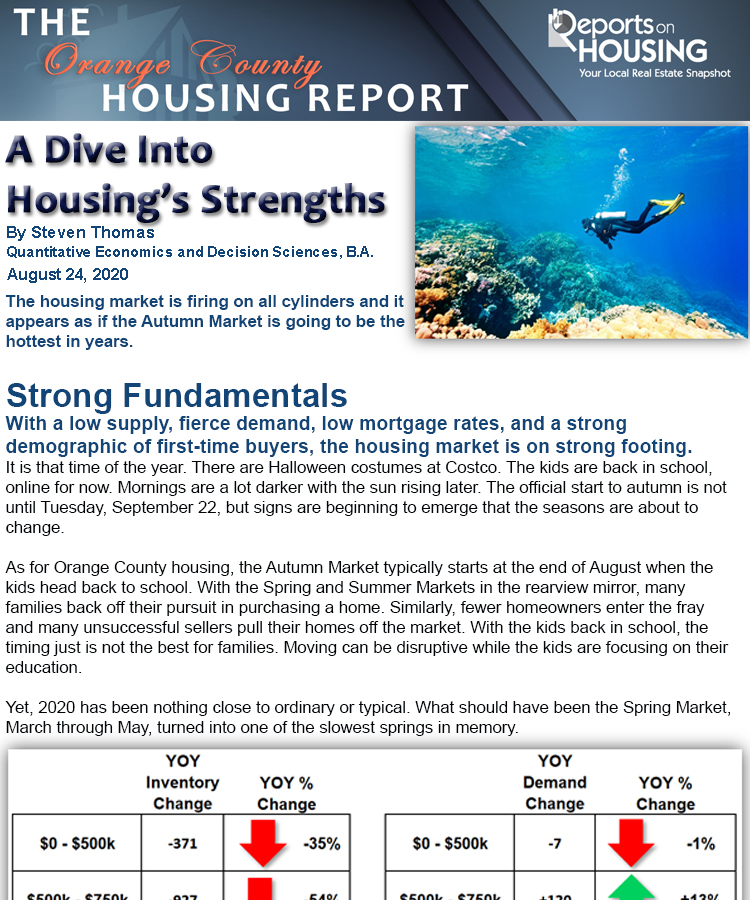 Yet, 2020 has been nothing close to ordinary or typical. What should have been the Spring Market, March through May, turned into one of the slowest springs in memory. The “Stay at Home” order and initial shock and anxiety of the Coronavirus kept buyers from buying and homeowners from selling. As the real estate industry adapted becoming an essential service, and the shock of the virus that included social distancing, sanitizing, and dawning a mask waned, housing surged. The Summer Market became the Spring Market in 2020. It appears as if the Autumn Market is going to be the Summer Market in 2020, not quite as hot as June, July, and August, but still quite busy with homes flying off the market and generating multiple offers. All signs point to an extraordinary September, October, and first half of November.