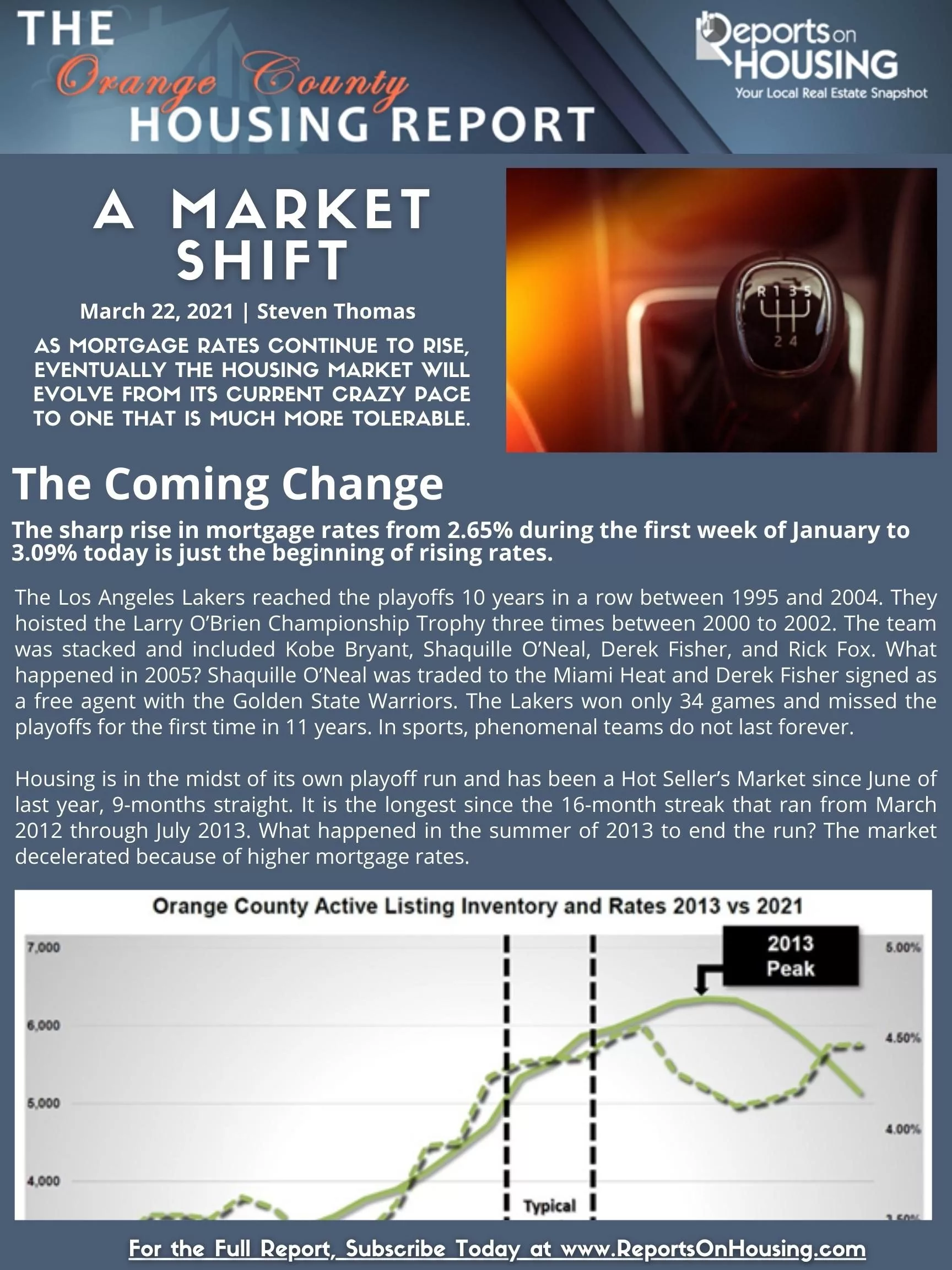 Now experts are expecting a robust second half of 2021, just a few months away, the start of the next “Roaring 20’s.” Mortgage rates are projected now to increase anywhere between 3.5% to 4%, depending on the size of the economic boom. That is precisely where they were bouncing around prior to the pandemic, a much more normal range. These higher rates will be the catalyst to the market shift and the market will decelerate.