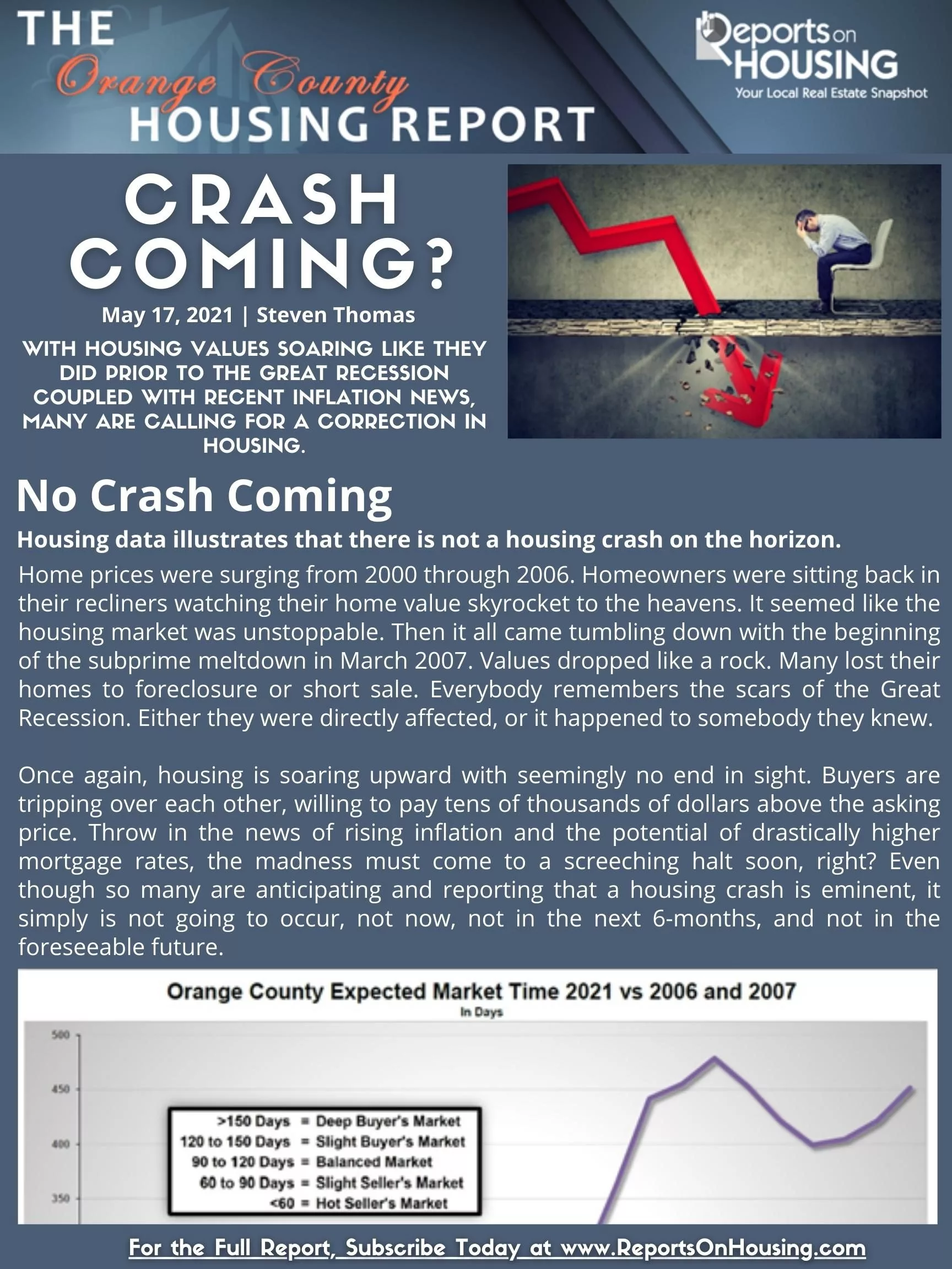 Once again, housing is soaring upward with seemingly no end in sight. Buyers are tripping over each other, willing to pay tens of thousands of dollars above the asking price. Throw in the news of rising inflation and the potential of drastically higher mortgage rates, the madness must come to a screeching halt soon, right? Even though so many are anticipating and reporting that a housing crash is eminent, it simply is not going to occur, not now, not in the next 6-months, and not in the foreseeable future.