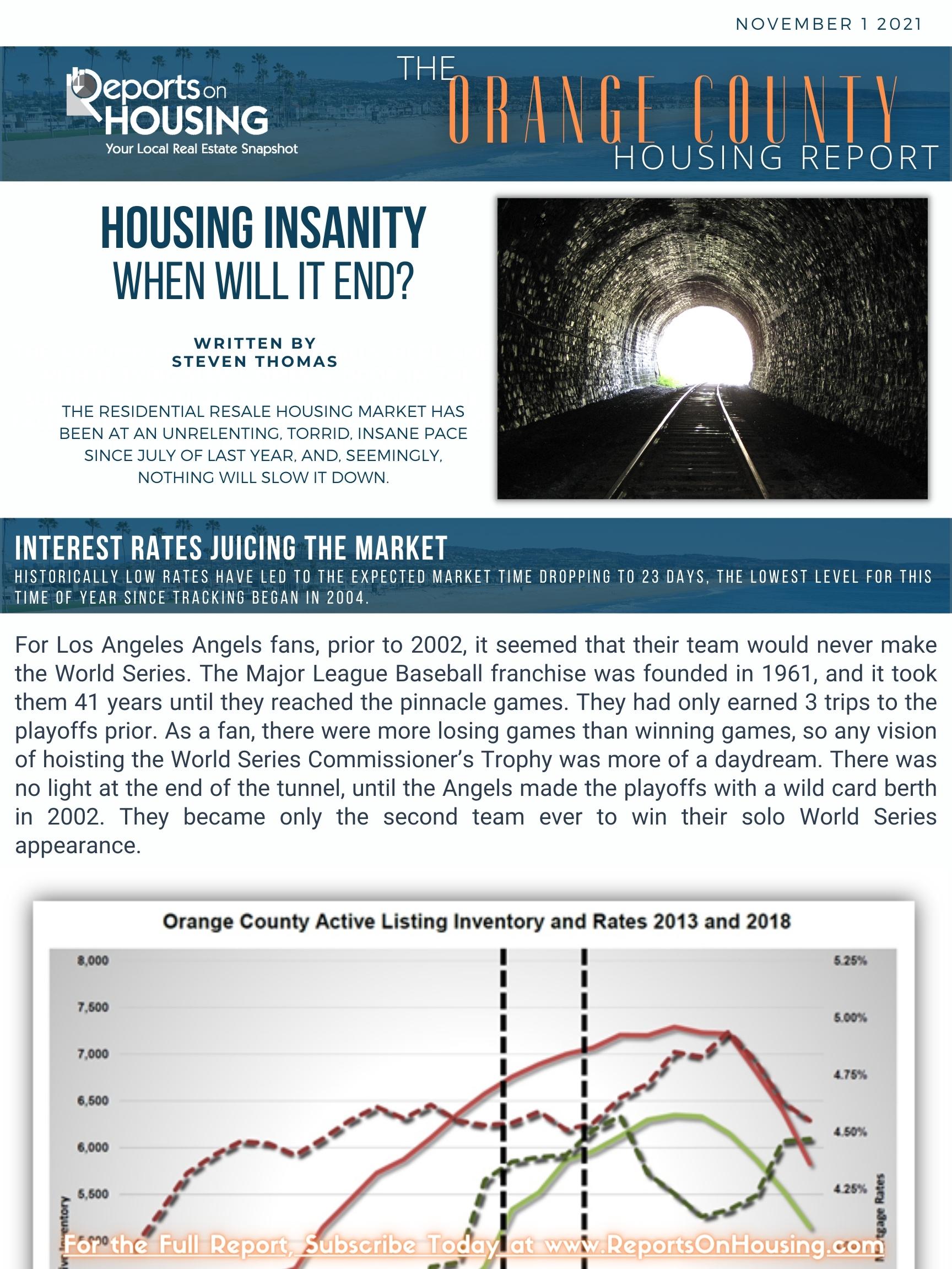 The light at the end of the tunnel with a shift in the market will not occur until mortgage rates rise substantially. Freddie Mac forecasted a couple of weeks ago that mortgage rates will rise to 3.5% in a year from now. That is not quite enough to slow housing meaningfully. Either rates eventually climb to slow housing, or values will climb to the point that they soften demand. The Orange County housing market is just not there yet.